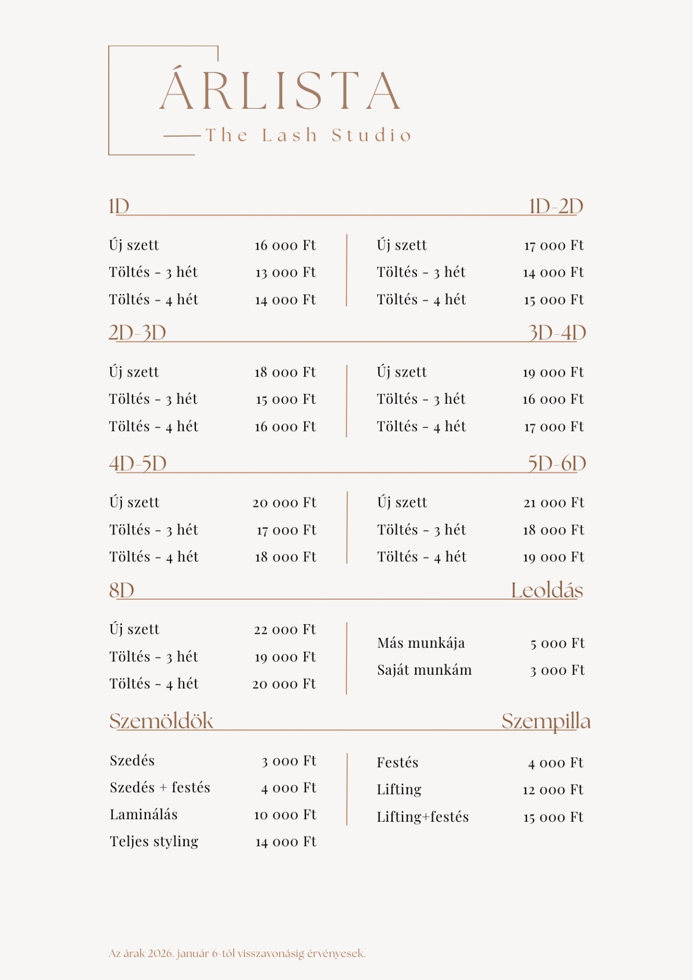 Az árak 2026. január 1-től érvényesek.